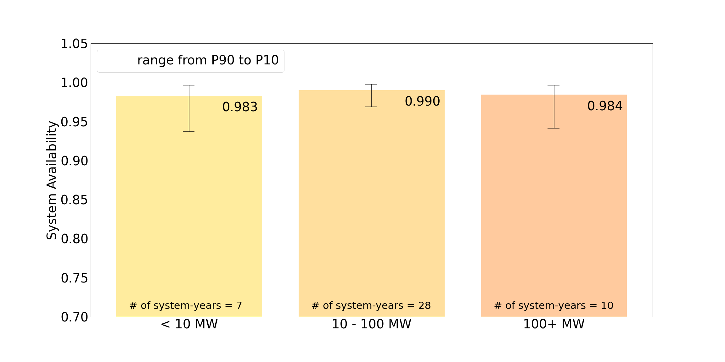 In Figure 4, the main bars represent system availability P50s by DC capacity, and the black lines represent the range from P90 to P10 for each grouping of DC capacities to convey the shape of the distribution. 90% of values in a distribution fall above the P90, while only 10% of values fall above the P10. Simply put, a system owner would expect their asset to achieve availability over the P90 value 90% of the time. We find that system availability seems to be independent of site size across utility-scale systems, and that the trend of a left-skewed distribution does appear to be present across all ranges of utility-scale systems. This highlights the need for PV systems of all capacities to adjust availability forecasts to match empirical findings.