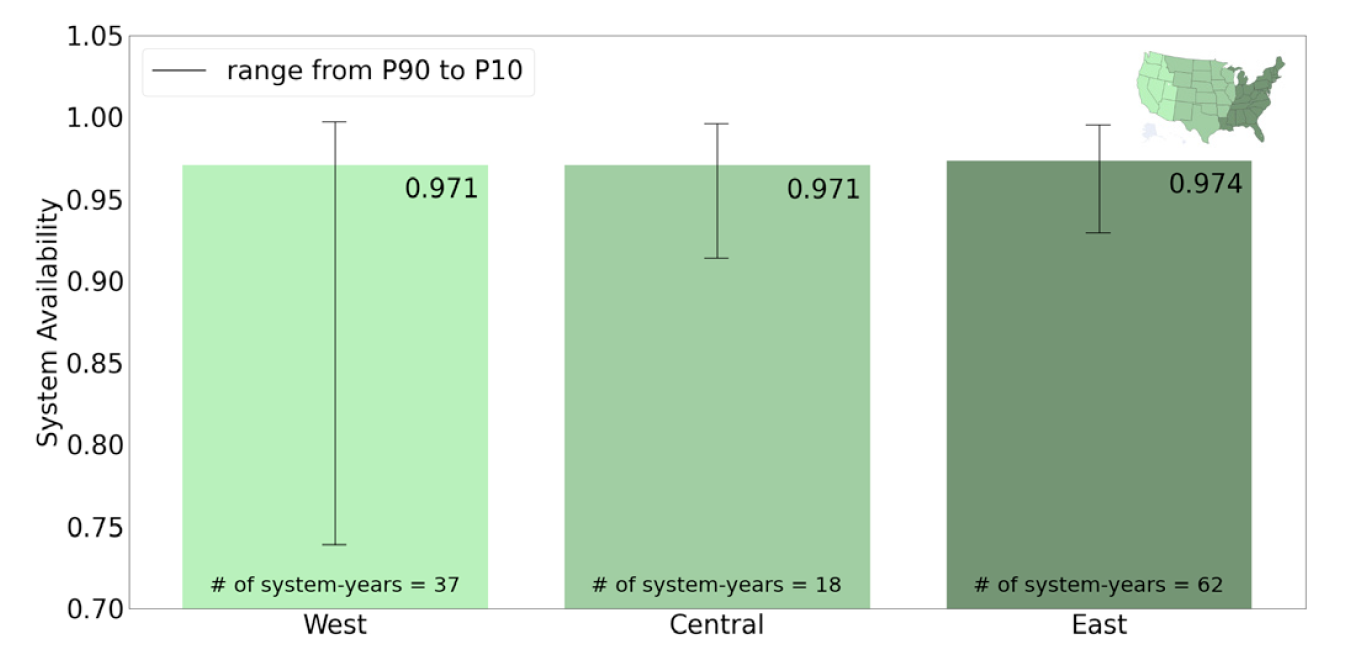 The results of an analysis of system availability across three regions of the US is shown in Figure 5. The regions are defined according to the legend in Figure 5, and again, the main bars represent the P50s and the black lines represent the range from P90 to P10 for each region. The long left tail trend emerges once more in each region, but appears to be most severe in the Western region of the country. While no one region stands out with lower P50s than the others, the consistent prevalence of a left-skewed distribution highlights the need for more accurate downside modeling in every PV site across the US.