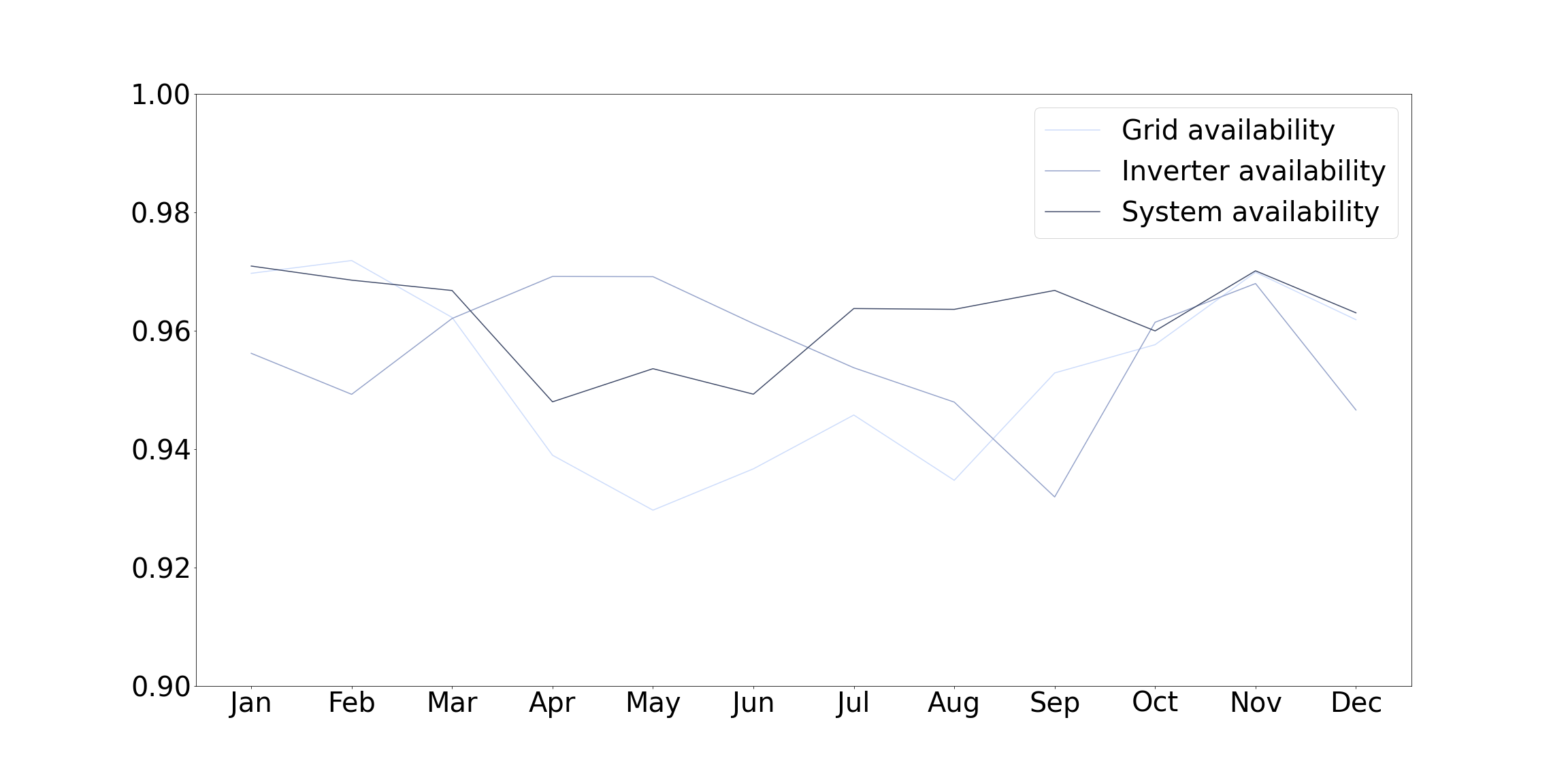 From the cleaned data, kWh Analytics averaged availability across the three kinds of metrics most often reported in the MORs that we see: grid, inverter, and system availability. The energy loss events included in each availability value is defined by the O&M provider, but in general, the following definitions provide an overview of these three kinds of availability: