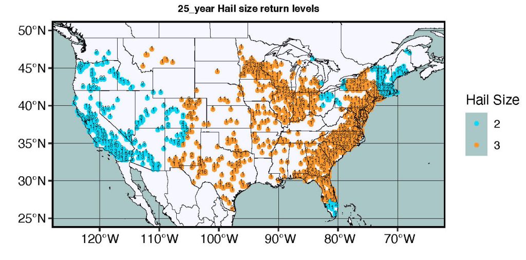 Using Bayesian modelling, researchers found that 91.18% of utility-scale solar locations in the US have a 10% annual chance (10-year return period) of seeing hail greater than 2 inches (50mm) within approximately 17 miles of their location. Perhaps more concerning, 64% of these locations showed hail over 3 inches for a 25-year return period. This includes sites in traditionally low-risk areas such as California, proving that hail risk is pervasive throughout the United States.