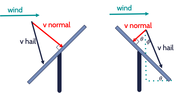 Therefore, a panel tilted at 60 degrees would be expected to receive only one-quarter of the impact energy of a flat installation, assuming no wind and that hail is falling straight down. When wind is present, the calculation remains the same; however, the velocity and fall angle of the hail may be affected by the wind (Φ below, Figure 3), ultimately affecting the impact angle with the module. While this model provides a valuable baseline, it is built on simplifications that don’t fully capture real-world hail behaviour.
