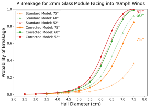 The real-world implications are striking. Using a traditional physics-based model that does not account for inelasticity, a 2mm glass module has approximately a 36% chance of breakage at ~3in (7.5cm) hail under 40mph winds when stowing at 75°. When we include inelasticity into modelling assumptions, the probability of breakage jumps to approximately 84%.